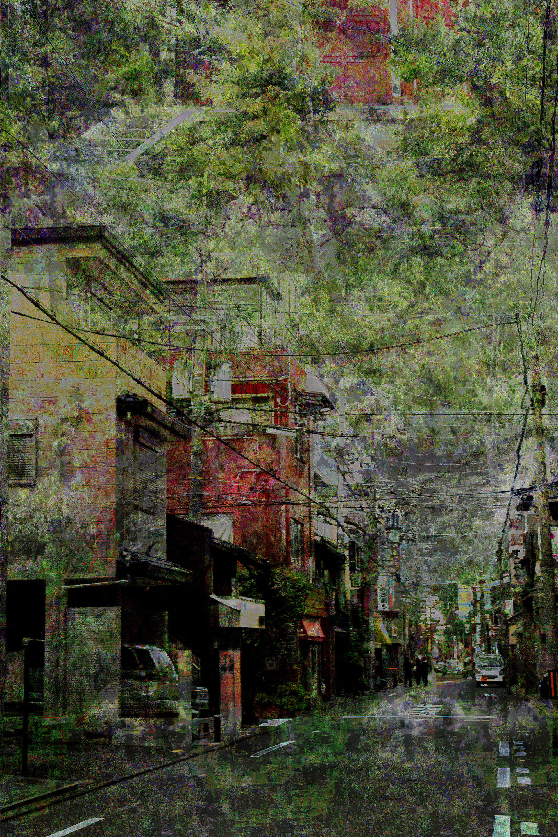 My only tangible link to the location is a single word— “Hiro”—translated from a sign captured within the image. Yet the memory of the space, its atmosphere and simplicity, continues to resonate through the work, as the feeling of natural space pulsated back into the city sensory and through the work.